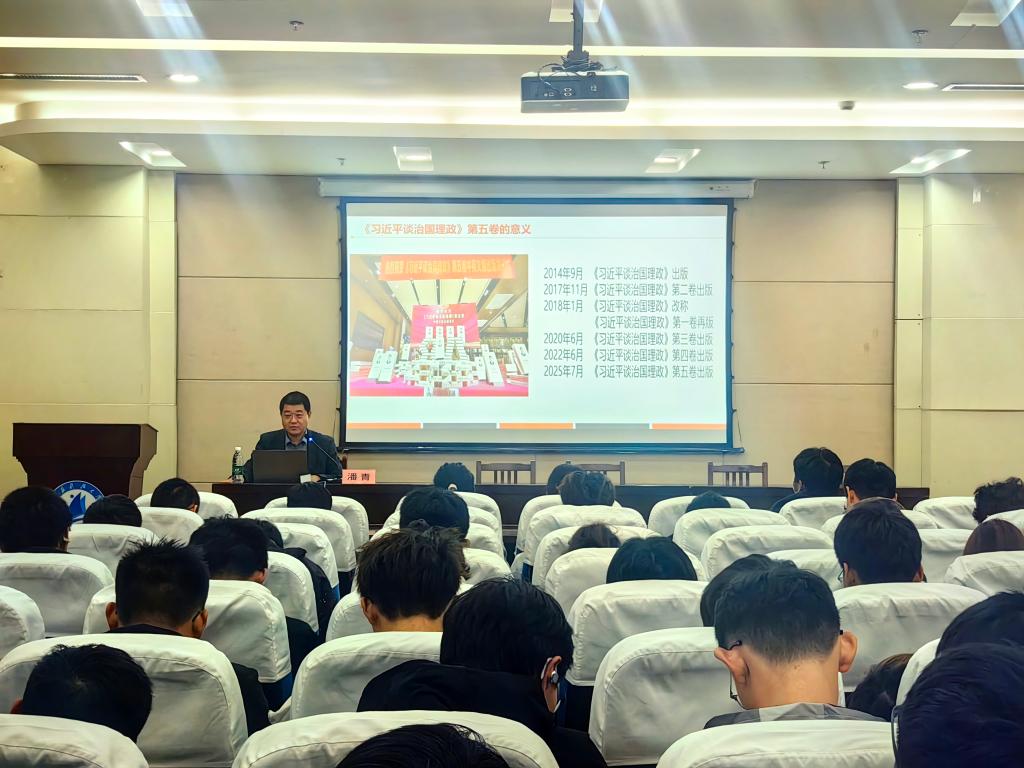 江苏科技大学苏州理工学院马克思主义学院副院长潘青受邀担任主讲嘉宾。潘青围绕《习近平谈治国理政》第五卷的核心要义展开深度解读,重点阐释了著作中蕴含的原创性治国理政新理念、新思想、新战略,通过系统梳理第五卷与前四卷的内在联系,阐明了深入学习该著作对更加深刻领悟“两个确立”决定性意义、增强“四个意识”、坚定“四个自信”、做到“两个维护”的重要性,鼓励同学们读原著、学原文、悟原理,及时跟进、深刻领悟其中的原创性理论和原理性贡献,努力把学习成效转化为坚定的理想信念,让“大国重器”的使命担当融入青春征程。